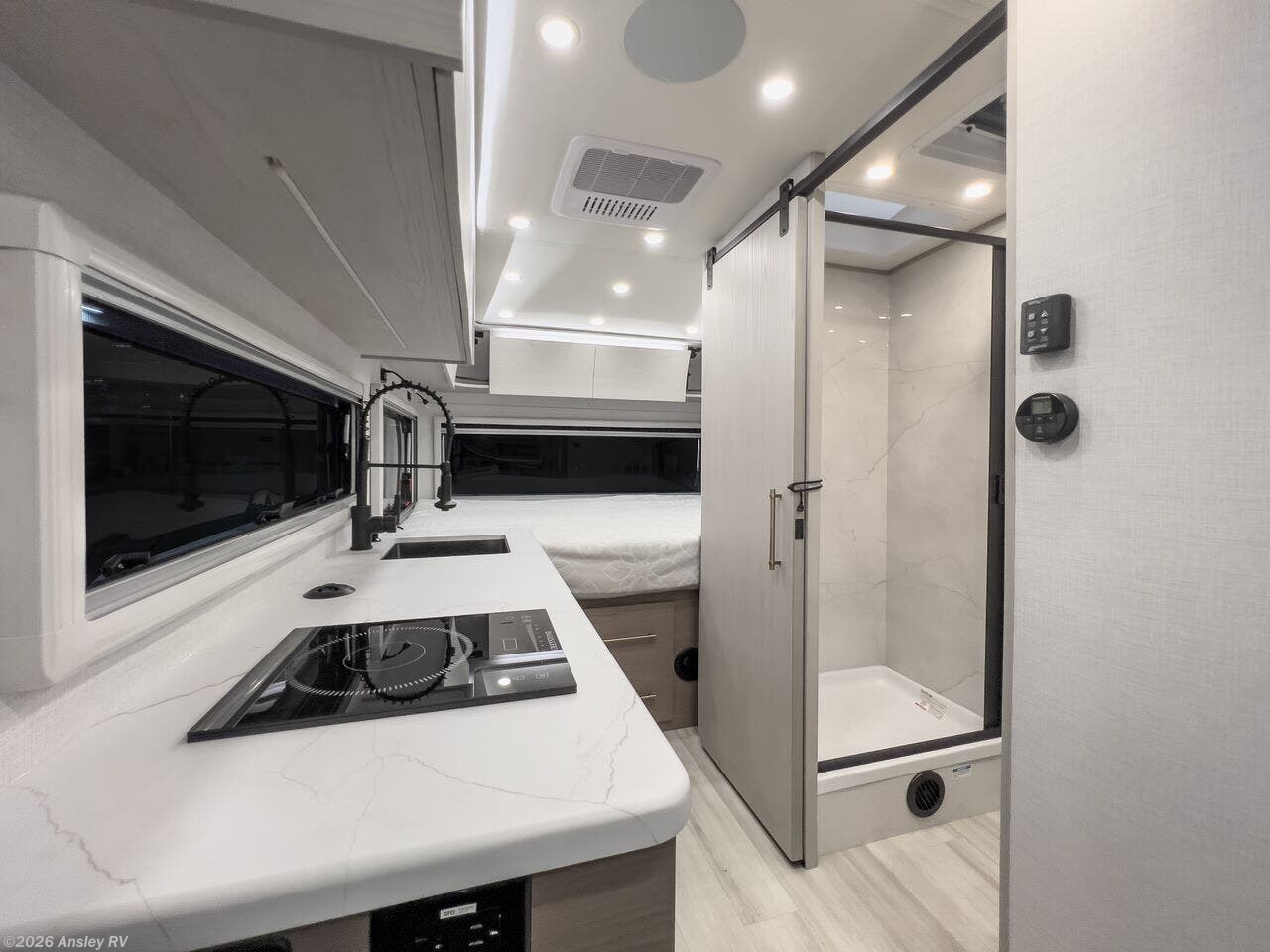Serenova Launch Package: Light-Weight Acrylic Windows w/Integrated Window Shades, Dry Bath w/ Seperate Shower, Seperate Sink and SeperateToilet, 8 cu. ft. 12V French Door Refrigerator, Lightweight European Cabinetry w/Soft Close Hinges & Drawer Glides, Residential 60 X 80 Queen Bed, High Efficiency Ultra-Low Profile AC System, Compass Connect, 24" LED TV, Soft Touch Ceiling Panels, MAXAire Power Fan, LED Flush Mount Interior Lighting, Induction Cooktop, Convection Microwave, Residential Kitchen Sink w/Pullout Faucet, On Demand 60K Tankless Water Heater